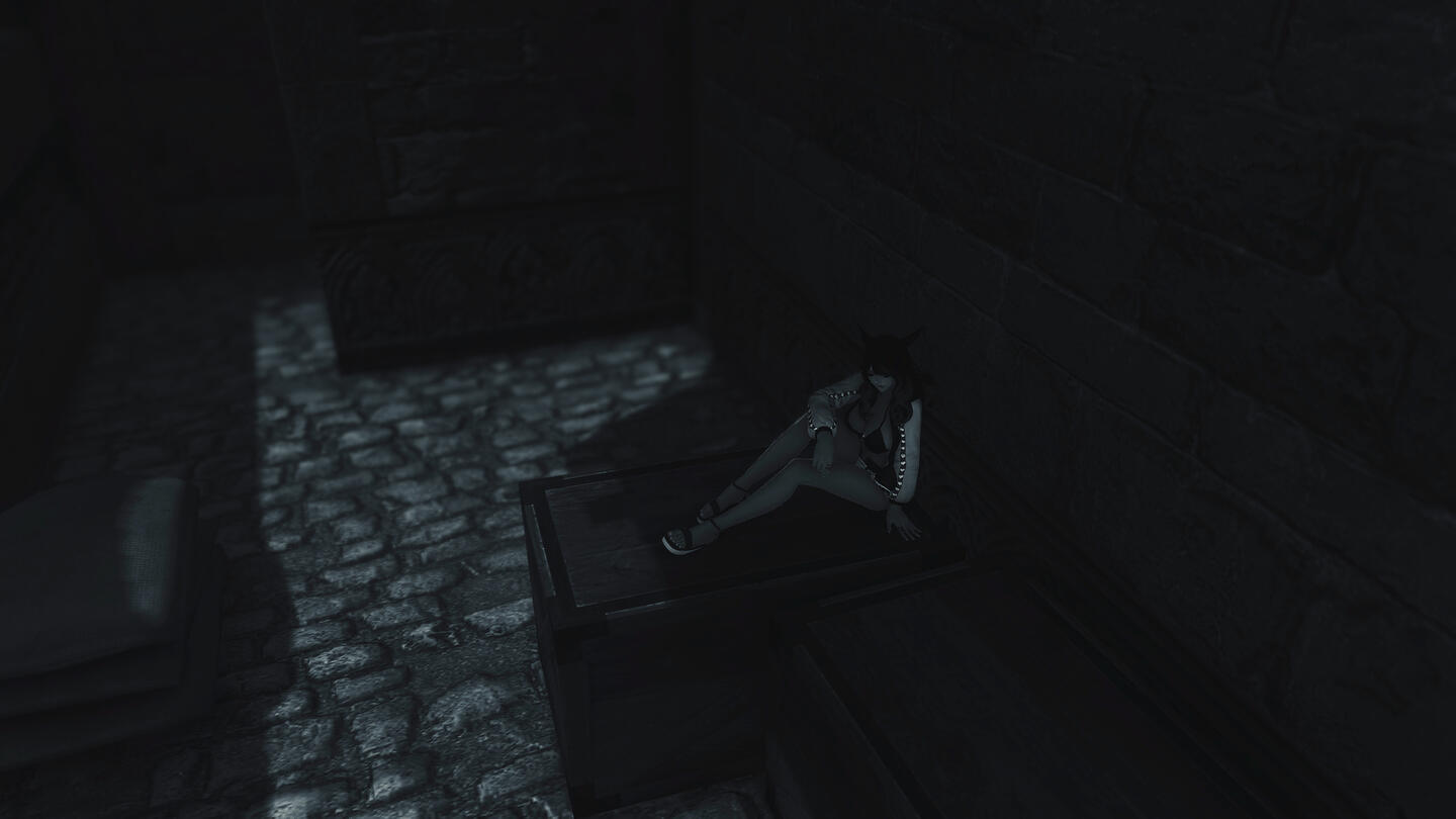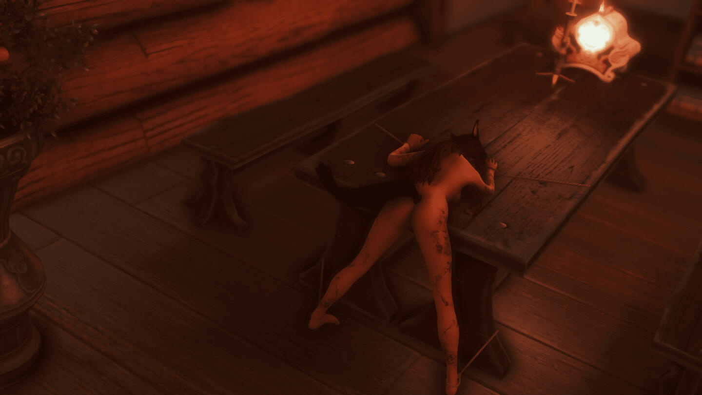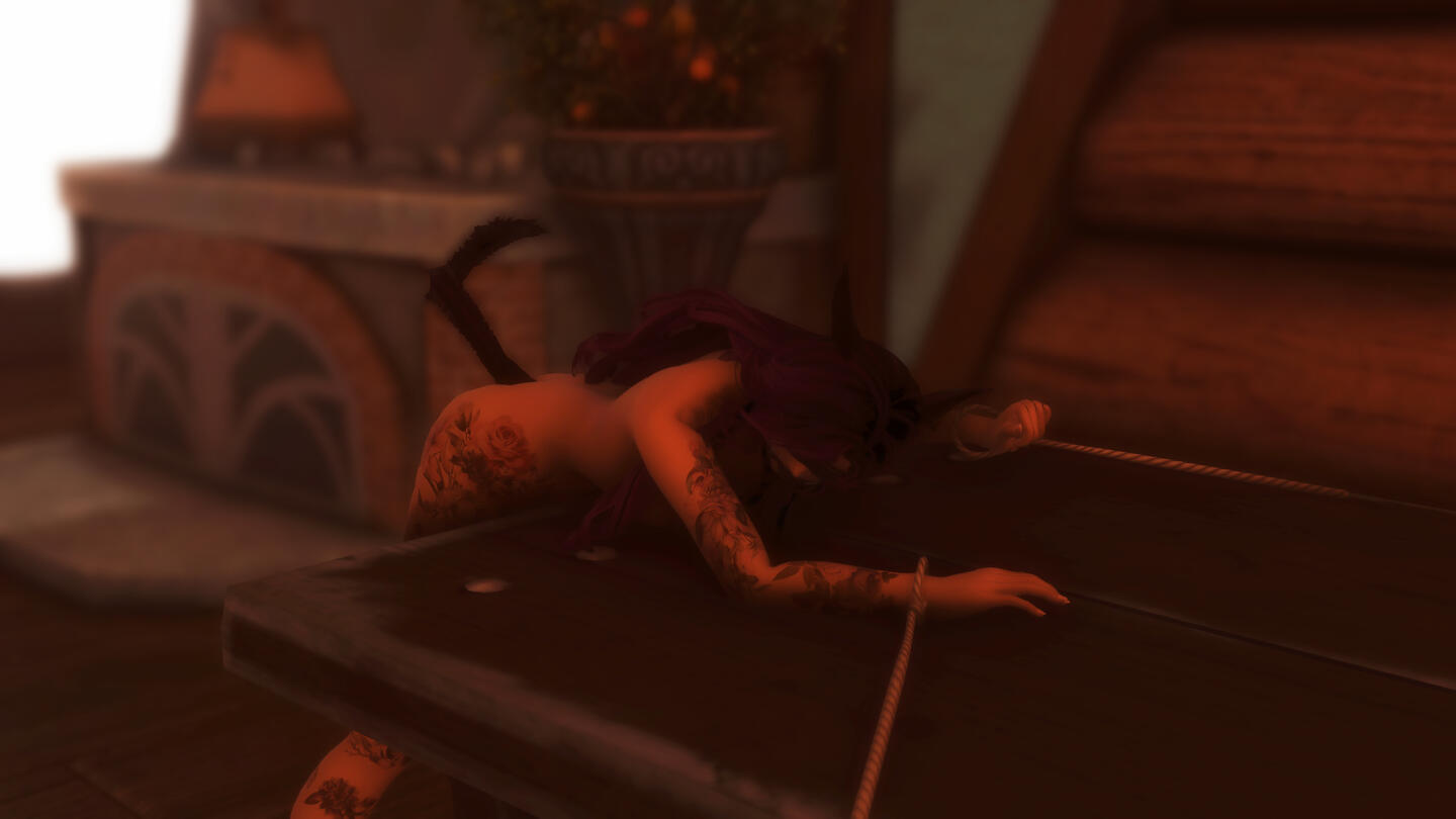 And then would come the knife, drawing its black from the sheath in which it was tucked, the gleam of it as one large hand quite simply...shoves her cheek to the floor. Pining it down, hard, rough, Scraping her soft cheek against the wood as he simply slices through her gear as much as he can. Letting it peel away . Bit by bit exposing that curved body. "Oh...you were worth every gil."
