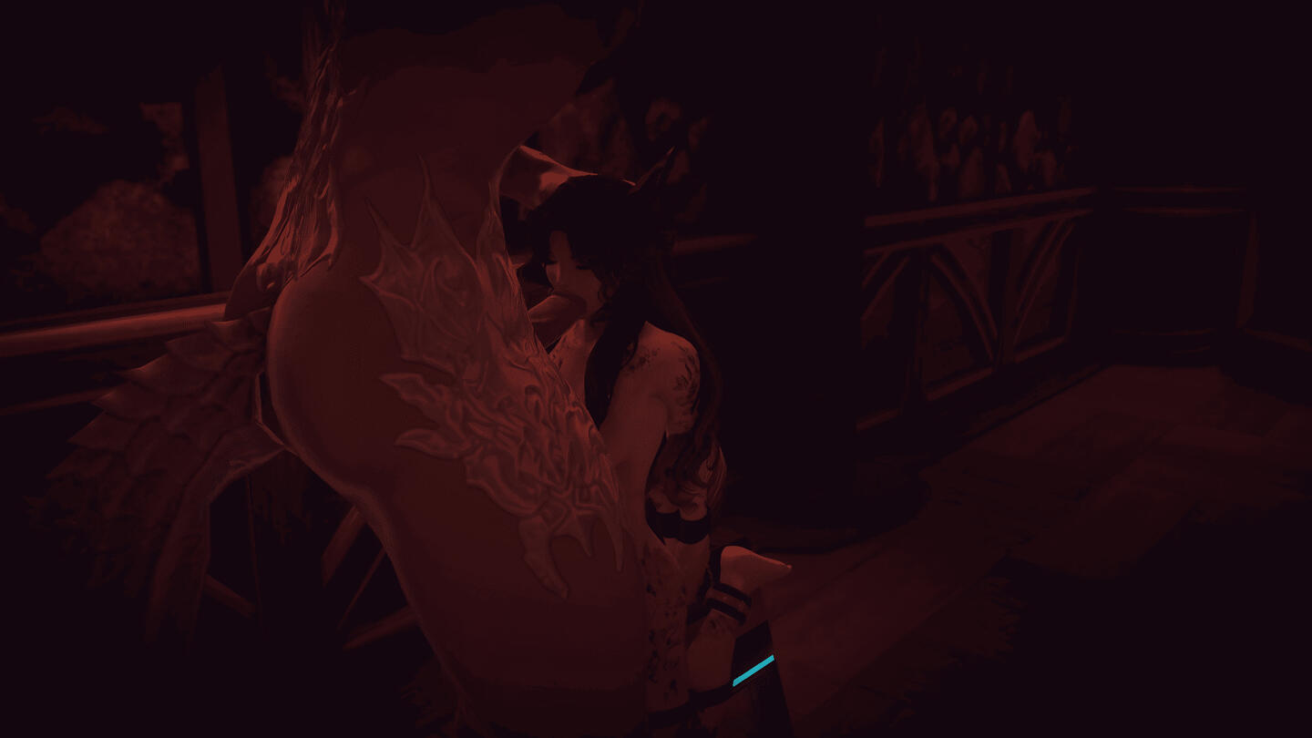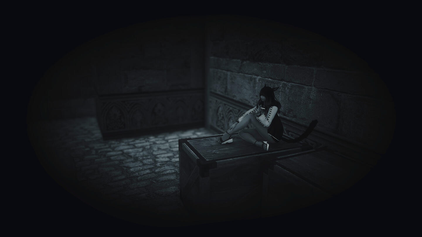 The au'ra his lips quirk into their own smirk to her response, following behind as his eyes travel over this tiny Miqo before him, There was no denying the way her short little form was curved.As they arrive in the alley she would take a seat on the broken barrel with a slight annoyed look on her face while looking at the place she normally does business "Guess here will do, don't worry about these folk.. They know their place and not to mess with me" as she gives him a smile which has a devious undertone.